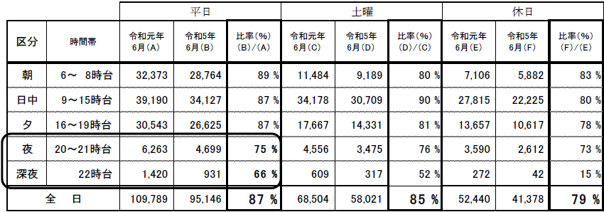 市バスの利用者数は、令和2年度にコロナ禍により大幅な減少が見られた後、令和3年度以降は徐々に増加傾向に転じてはいるものの、本年6月時点では、令和元年度比で平日は8割、土曜・休日も8割前後の回復に留まっており、特に、平日の利用者数は、夜の20時から21時台は約7割、22時台は約6割となっている現状です。