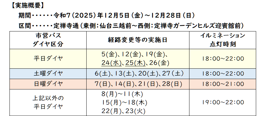12月5日(金)~28日(日)に開催される「2025 SENDAI光のページェント」の期間中、市営バスの一部の路線で経路や乗り場を変更します(※変更内容により実施日が異なります。)。