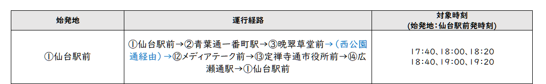 | 【実施時間帯】 | るーぷる仙台バス停 ①仙台駅前を17:40~19:20に発車する便 |
