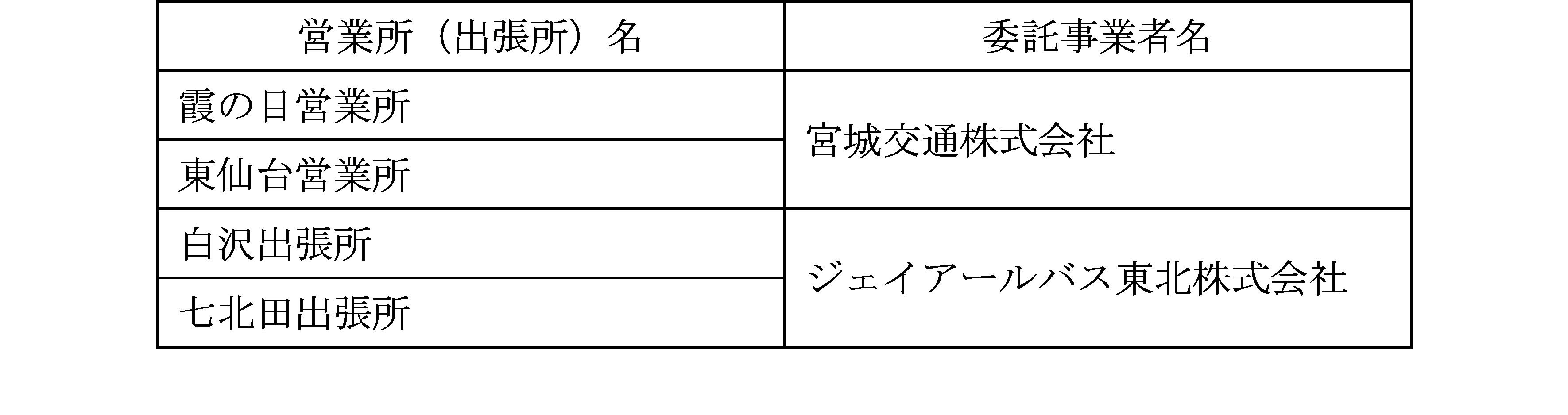 行管理及び整備管理業務を民間バス会社に委託しています。民間に委託できる事業量は全体の50%以内と国で定めており、下記の営業所、出張所が担当する路線(令和4年1月時点で全事業量の49.1%)を民間バス会社に委託しています。