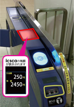 A:地下鉄の自動改札機、バスの乗車口のカード読取機(降車時は運転席横の運賃箱)の読取部中央に音が鳴るまでしっかりタッチしてください。入金(チャージ)残額が最低(初乗り)運賃に満たない場合でも、乗車(入場)できますが降車(出場)することができません。入金(チャージ)を行ってから改札機・運賃箱の読取部にタッチして降車してください。地下鉄では、精算機で不足額(10円単位)のみ入金(チャージ)することもできます。バスでは、不足額(10円単位)を現金でお支払いいただくこともできます。詳しくは、icscaを使うをご確認ください。