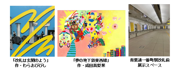 地下鉄青葉通一番町駅改札内外の展示スペースにおいて、FAF/フェイフの公募・選定により、地下鉄東西線等をテーマとした約20作品を展示します。展示作品は購入可能です。また、作品は定期的な入れ替えを予定しています。
