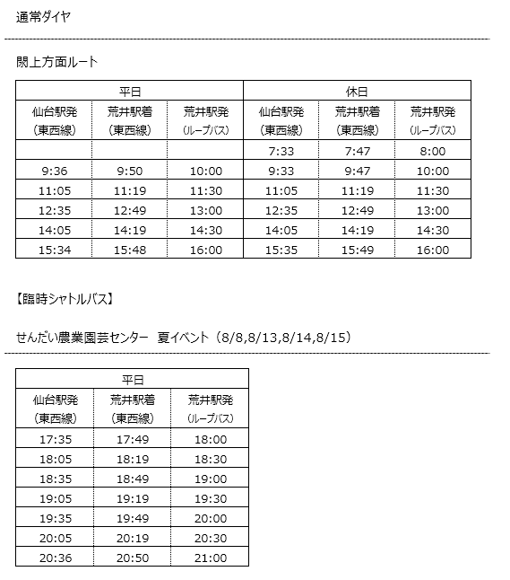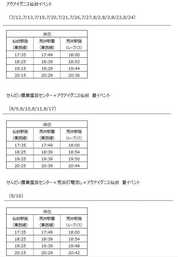 令和7年7月1日(火)から令和8年2月28日(土)まで、地下鉄荒井駅発着で仙台東部海浜エリアを周遊するループバスが運行されます。ループバスご利用の際は是非地下鉄東西線をご利用ください。ループバスに乗車するには、以下の地下鉄をご利用いただくと便利です。