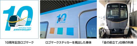 仙台市交通局では、令和8年1月8日(木)まで、「金の前立て」編成に東西線開業10周年記念ステッカーを掲出して運行しています。
