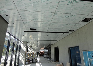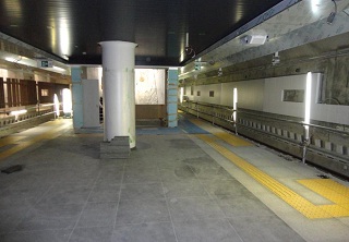 地上建屋の外観です。(北側より) 地上建屋1階コンコースの様子です。 天井パネル工事を施工中です。 地下1階(ホーム階)の様子です。 ホームの床石工事を施工中です。 引き続き、建築工事及び設備工事を進めていきます。